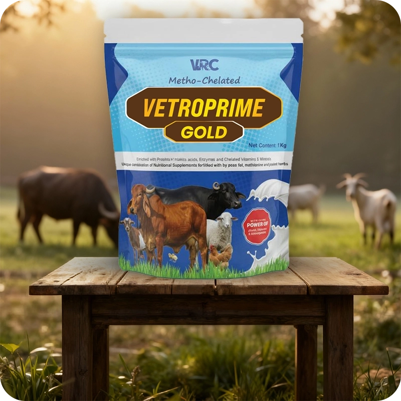 VetroPrime Gold is a premium multi-vitamin and mineral supplement formulated to enhance milk yield, boost immunity, and improve overall animal health. Enriched with Chelated Minerals, Vitamins, Amino Acids, and Energy Boosters, it supports better fertility, faster recovery, and optimum productivity in dairy animals.