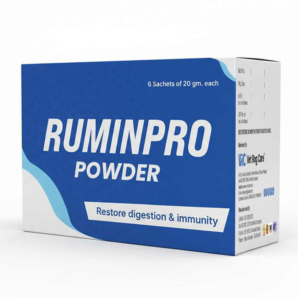RuminPro Powder is a scientifically formulated digestive enhancer and rumen conditioner for dairy animals. It helps maintain healthy rumen function, improves feed digestion, and boosts overall animal productivity. Enriched with Probiotics, Enzymes, Vitamins, Yeast Culture, and Herbal Actives, it promotes better nutrient absorption, appetite, and milk yield.